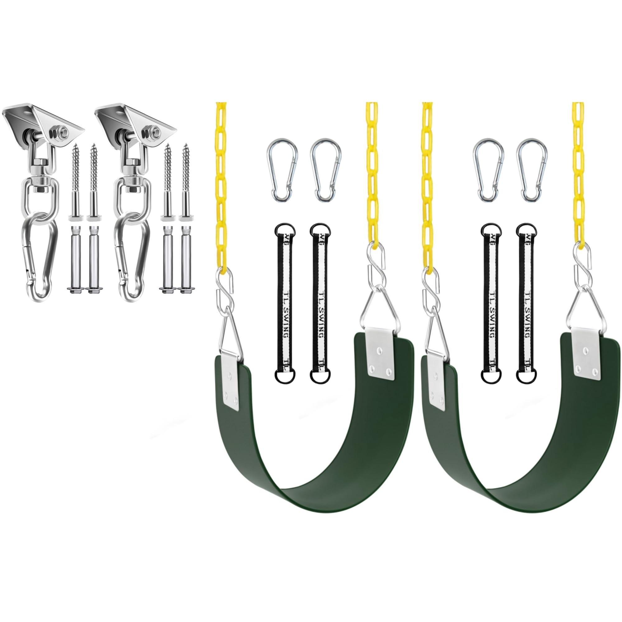 - Features:STURDY TRIANGULAR METAL RINGSREINFORCED SOFT EVA SEAT FOR COMFORTRUBBER COATING CHAINS FOR SAFETYWEATHER RESISTANT AND NON-FADINGFULLY ASSEMBLED, EASY TO LNSTALLEXTRA HANGING STRAPS & CARABINERSInvest in the Swing Set by GAMKII, and watch as your children create lasting memories while engaging in active outdoor play.About Product:Safety is a top priority with this swing set. The swing seat is constructed from a sturdy EVA material, offering both comfort and durability. The swing chains are rustproof, further enhancing their reliability and longevity. Parents can have peace of mind knowing that their children are secure and stable while enjoying the swinging experience.With a weight capacity of 300 pounds, it is built to withstand the active play of older children, ensuring long-lasting use.Installation is quick and hassle-free, allowing for immediate enjoyment. The swing set includes all the necessary hardware and clear instructions for easy setup. Whether it's in the backyard, playground, or any outdoor space, this swing set is the perfect addition to provide hours of fun for your little ones.Package:2 * Fully Assemble Swing Seat4 * 66 Inch Chains4* Extra Snap Hooks4* Extra Hanging Straps