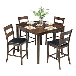 - Introducing our 5-Piece Dining Set, perfect for family dinners and gatherings! This set includes one table and four chairs, crafted with a sturdy elm wood veneer tabletop and chair backs, complemented by rubberwood legs that resist moisture. Each chair features an ergonomic design with a curved backrest for added support, a comfortable sponge cushion, and easy-to-clean black PU surface. The reinforced corner structure ensures even weight distribution, making them durable and reliable.Our dining set fits seamlessly into various decor styles, from vintage and farmhouse to modern aesthetics, and can even serve as a stylish desk. Specification:-Dimensions (Table): 40.6"W x 40.6"D x 36"H-Dimensions (Chair): 16.7"W x 15.2"D x 39.4"H-Suitable for 2-4 People Dining- Each Table Holds Up to 250 lbs- Each Chair Supports 275 lbs, - PU Cushion- Elm Wood Veneer