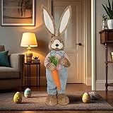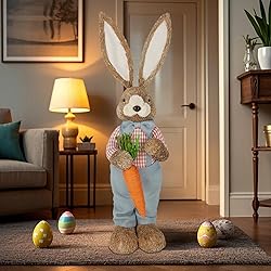 Straw Bunny: Enhance your Easter and spring decor with these straw standing bunny sculptures. The charming decorations are built to last and sure to bring joy to your home. The sturdy base ensures stability and prevents easy tipping. Adorable Design & Eye-Catching Appeal: This Easter Bunny decoration features a charming costume with blue overalls and a plaid shirt, complemented by a blue bowtie, creating a cute and playful look. Holding a bright orange carrot in its hand, the design adds a touch of liveliness and vibrancy, effortlessly capturing the attention of every visitor. Every detail of the design exudes sophistication and charm, capturing the essence of spring. Easter Decoration: The Easter standing sisal bunny is decorated up to 2.7 FT and eye-catching, this Easter bunny figurine is a highlight for any indoor or outdoor setting. Whether it's placed in a farmhouse, on a porch, by an entryway, or in the garden, this decoration effortlessly creates a unique and delightful ambiance. Festive Atmosphere: Whether for Easter or other springtime celebrations, this giant straw bunny makes for an excellent decor piece or a special gift for family and friends. Whether placed at the front door to greet guests or hidden in the garden as a delightful surprise, the bunny figurines are destined to be the centerpiece of attention. High-Quality Materials & Natural Vibes: Our Easter sisal rabbit statue is handcrafted from straw, emanating a natural and rustic charm. The design incorporates seasonal elements, seamlessly blending with farmhouse decor. Its aesthetic appearance and humble allure are sure to add a splash of character to your home.