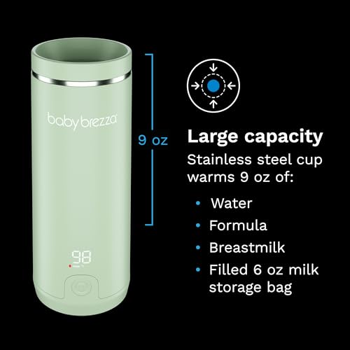 The Baby Brezza SuperFast Portable Bottle Warmer is the fastest, most advanced way to warm breastmilk, formula, water or a filled milk storage bag on the go. Now available in bold Green color. It's clinically proven to warm up to 67% faster than other portable warmers, including 8 oz in 3 minutes (from room temp to 98°F). Its Advanced Sensor Technology safely and evenly warms milk and formula from top to bottom, protecting nutrients. No more adapters, leaks or turning bottles upside down! This rechargeable travel warmer warms up to eight 6 oz bottles (from room temp to 98°F) on a full charge, and it easily fits in cupholders or bottle pockets in diaper bags and backpacks, cars and strollers. The interior stainless-steel cup holds 9 oz of liquid or a filled 6 oz milk storage bag, and the dishwasher safe lid features a 360° pour spout. Choose from 4 warming temperatures: 80°F, 98°F, 99°F, or 103°F. Includes USB-C charging cable. Full charging time is 3-5 hours depending on power adapter (not included). Use 20W charging block for fastest charging. Charges in 3 hours with 18W charging block & 5 hours with 10W charging block. 1 year limited warranty (not valid if shipped outside the US)