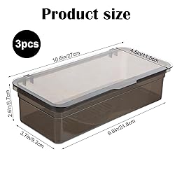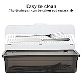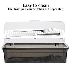 - Rainmae 3Pcs Flatware Tray with Lid and Drainer, Large Plastic Silverware Utensil Kitchen Drawer Organizer Clear Cutlery Storage Container with Cover Dinnerware Holder Box for Home and Travel Features: Space-Saving: Designed for efficiency, this portable plastic cutlery holders can be stacked to save space in your kitchen drawers or on countertops, allowing for quick and efficient organization. Easy to Clean: The utensil container with cover are designed with cleanliness in mind. They can be easily wiped down with water. Easy Accessibility: The simplicity of our design ensures that your utensils are always within easy reach. The transparent lids and open structure make it a breeze to grab what you need, enhancing the convenience of your kitchen workflow. Specification: Material: Plastic Color: Black Size: 10.63" x 4.72" x 2.76"(27x12x7cm) Weight: 16.19 oz(459g) Package includes: 3 flatware trays Notes: Manual measurement, please allow slight errors on size. The color may exist a slight difference due to different screen displays.