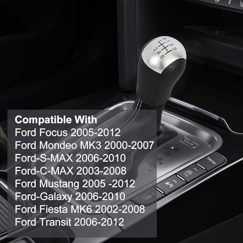 - Compatible with: 6 speed shift knob is compatible with Ford Mustang 2005 -2012, for Ford Focus 2005-2012, for Ford Mondeo MK3 2000-2007, for Ford-S-MAX 2006-2010, for Ford-C-MAX 2003-2008, for Ford-Galaxy 2006-2010, for Ford Fiesta MK6 2002-2008, for Ford Transit 2006-2012.