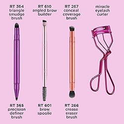 Real Techniques Double Time Brush + Lash Set includes: (1) Triangle Smudge Brush + Precision Definer Brush, (1) Angled Brow Builder + Brow Spoolie, (1) Crease Eraser Brush + Conceal Coverage Brush, & (1) Miracle Eyelash Curler Dual-ended makeup brushes help you achieve a full eye makeup look using all your favorite liquid, cream, and powder single shadows or eyeshadow pallets. Apply, blend, and sculpt eyeliner, eyeshadow, brow gel, brow pomade, brow powder, and concealer Lash curler designed with a pinch-free, curved edge that fits all eye shapes and wide handles for maximum control. Soft rubber base provides gentle curling for long, lifted lashes. For an extra volumizing look, top with a coat of mascara Real Techniques brings you premium, high quality makeup brushes, sponges, tools for both beginner users and professional makeup artists, while also remaining affordable- Quality without compromise because your makeup is only as good as your tools Makeup brush set includes travel caps for mess-free storage. Eyeshadow brushes also makes a great gift for women, or any makeup-lover in your life- whether it’s for a birthday, Christmas, Mother’s Day, Valentine’s Day or just because