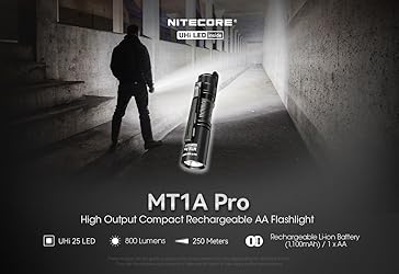 Discover the Nitecore MT1A PRO, a compact and durable flashlight designed for outdoor adventures and daily use. High lumens, waterproof, and rechargeable. Nitecore MT1A PRO: Max Output 800 Lumens; Max Beam Distance 250m; Max Beam Intensity 15,700cd; Max Runtime 10 h 0 m / 0.41 d; LED NiteLab UHi 25 LED Nitecore MT1A PRO - Compact, Durable, Rechargeable High Power Flashlight For Every Day Venture Nitecore MT1A PRO High Output Compact Rechargeable AA Flashlight -800 Lumens