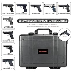 - The HOSOCASE hard gun case is a robust, reliable storage and transport solution for firearm owners. Designed to fit most handguns up to 9.4 inches in hypotenuse length, it accommodates popular models like Glock, Sig Sauer, and Beretta. Made from ABS, this case provides military-grade strength with dustproof and waterproof protection. It features pre-cut foam that holds 6 pistols and 24 magazines securely, with space for handgun accessories like ammo, holsters, and earmuffs. TSA-approved lock points ensure safe travel, while the case’s compact size and light weight make it air travel-friendly. Whether as a handgun case or a gun carrying case, HOSOCASE offers unparalleled durability and protection for your firearms, making it the ideal choice for law enforcement, military, and firearm enthusiasts.