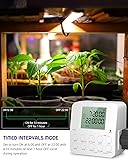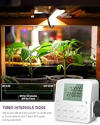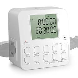 Multiple Timer Modes for Ultimate Convenience: This indoor outlet timer offers four advanced modes to meet all your scheduling needs: Always On/Off Mode, infinite interval cycle mode, timed interval cycle mode, and a 7-Day Programmable Mode. With up to 20 groups per day and 140 ON/OFF programs in total for a week, plus Random, Daylight Saving Time (DST), and Clock functions, this timer is perfect for managing your home appliances efficiently Easy to Use: Lamp timers programmable indoor, featuring an upgraded large display, all key information is clearly visible on a single screen. Designed with an intuitive button layout, this dual-outlet timer allows you to control two appliances simultaneously with ease. Each function and program can be easy to find and modified independently, eliminating the hassle of repeated settings. Plus, the built-in rechargeable battery automatically saves your programs during power outages Infinite Interval Cycle Mode: Digital timer outlet, set customizable ON/OFF intervals in hours, minutes, or seconds that repeat indefinitely until manually turned off. (The max time is 99 hours and the min setting time is as precise as 1 second)Ideal for grow lights, irrigation pumps, misting systems, aquarium filters, and more. Example: Program a humidifier to turn ON for 30 minutes and OFF for 1 hour continuously. Timed Interval Cycle Mode: Plug in timers for electrical outlets, customize ON/OFF intervals within a specific time period (Week/Hours/Minutes/Seconds) to automate appliances efficiently, up to 20 programs group for each day, the min setting time is as precise as 1 second. Example: Set a ventilator to turn ON for 30 minutes and OFF for 1 hour from 8:00 to 20:00 daily. Perfect for irrigation, air circulation, or other scheduled routines 7-Day Programmable Timer Mode: Electric timers for electrical outlets, set up to 20 timer programs per day, allowing you to automate appliances on a daily or weekly schedule. Great for lights, fans, heaters, humidifiers, aquariums, indoor sprinklers, nebulizers, and more, ensuring your devices run according to your routine.Example: Set a Christmas lights to turn ON at 18:00 and OFF at 24:00 daily