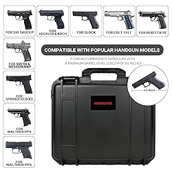 - The HOSOCASE hard gun case is the ultimate solution for securely storing and transporting your firearms. Designed to fit most handguns under 9.8 inches in hypotenuse length, this versatile gun case is perfect for a wide range of pistols, including popular models like Glock, Smith & Wesson, and Beretta. Featuring a durable HMW Copolymer PP construction, this pistol case offers military-grade strength, dustproof, and waterproof protection with an IP67 rating, ensuring your firearms stay safe in all environments. The interior includes pre-cut, non-abrasive closed-cell foam that securely holds up to 4 pistols and 24 magazines, and can be easily reconfigured to accommodate accessories like ammunition, holsters, and earmuffs. With TSA-approved lock points and a lightweight design, this handgun case is perfect for air travel. Whether used as a gun carrying case or a gun box for handguns, it provides unmatched durability and protection for your firearms, making it an essential storage solution for firearm owners, law enforcement, military personnel, and enthusiasts alike.