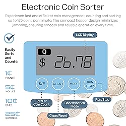 - Jam-Reducing Hopper: With an improved coin distribution system from the hopper to reduce the barrel-jamming issue. Value Counting : Display total amount of coins counted/sorted. Digital Display. Keeps track of total amount counted and sorted per each run. Intuitive Operation : $/# I Mode I Clear I Run/Stop. Sort Into Coin Wrappers.