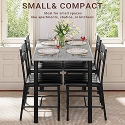 SPACE-SAVING DESIGN: This compact dining table measures 43.3"(L) x 27.6"(W) x 29.9"(H), perfectly sized to comfortably seat up to 4 people. The compact design makes it an ideal breakfast table for smaller dining areas or kitchens. Chairs neatly fit under the table for efficient storage and space-saving 5-PIECE DINING SET: This functional dining table set includes a dining table and two dining chairs. The small dining table fits 4 people for quick workday snacks, morning coffee, or couple gatherings.Chairs offer support with high backrests and thick padded seats for comfortable seating INDUSTRIAL AND MODERN STYLE: This dining table and chair set is crafted from rustic MDF wood and steel frames, showcasing a sleek woodgrain finish and an I-shaped design that creates an attractive industrial look in your dining area, seamlessly complementing various room styles COMFORTABLE AND DURABLE: A thick, MDF wood table with cushioned chairs combined with thicken steel frames provide reliable quality and comfortable use. The chair's reclining backrest offers optimal back support for comfortable extended sitting.TABLE WEIGHT CAPACITY: 220 lbs.; CHAIR WEIGHT CAPACITY: 300 lbs EASY TO CLEAN & MAINTAIN: The table top and seats are coated with PVC which is especially easy to clean and resistant to dirt and grease. Simply wipe clean with a damp cloth for effortless maintenance. The table edge is curved to prevent injuries SIMPLE ASSEMBLY: The wooden kitchen table and chairs are designed for straightforward assembly, complete with detailed instructions and illustrations to make the process hassle-free. Feel free to contact us for any questions or quick responses