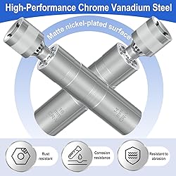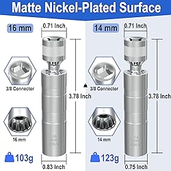 - Quality Material: The spark plug removal tool is made of high-performance chrome vanadium steel, with matte nickel-plated rust-resistant surface, resistant to abrasion and corrosion, to ensure that it will not be damaged in long time use 360 Degree Rotation: Unique universal joint design makes the magnetic spark plug socket can be rotated 360 degrees freely, easy to cope with a variety of narrow space, flexible operation without obstacles, become your indispensable right-hand man when repairing your car Easy to Use: The swivel head is tightly integrated with the ratchet wrench, and the top fixing design ensures that the spark plugs are not easy to be lost during installation and removal. Meanwhile, the spark plug socket adopts 12-point design to enhance the grip, with knurled handle to provide a firm grip and effectively reduce hand fatigue Wide Compatibility: This swivel spark plug socket adopts thin-wall design, which is compatible with Nissan engines and various MINI models (such as R55, R56, R57, R60), and also suitable for several BMW models, including 1 Series (E81/E87-N43B), 3 Series (E90-N43B) and 5 Series (E60-N43B), which can meet the needs of most models Built-in Magnetic Ring: The package includes 1pc 14mm and 1pc 16mm magnetic rotatable spark plug sockets, which are designed with a 10mm deep magnetic ring inside, which can effectively clamp the spark plugs, preventing them from slipping off or being clamped too tightly, providing you with a safer operating experience