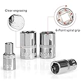 Premium quality: Our socket set are all made from premium quality chrome vanadium steel alloy, and its mirror chrome plated finish perfectly achieved outstanding strength and wear resistant. What you get: Our socket wrench set included 14pcs bit sockets: SL4,5.5,7,PH1,3, HEX 3,4,5,6,T10,15,20,25,30 and 12pcs 1/4 DR metric sockets:4mm;4.5mm;5mm;5.5mm;6mm;7mm;8mm;9mm;10mm;11mm;12mm;13mm Widely used:Each sleeve is clearly labeled with specifications for quick identification. In addition, we also provide a 4in long drive extension rod, also made of chrome vanadium steel material, which is very suitable for use in areas where direct contact is difficult. Easily used and storage: 1/4 socket set comes with quick release switch and reversible mechanism for easy operation.The rubber handle for better and more comfortable grip. Its sturdy blow molded toolbox makes the sockets easy to store and carry. Wide Application: 1/4 drive socket set perfect for home improvement, carpentry, construction, auto repair, woodwork, and other DIY projects; makes a unique and thoughtful gift for men on occasions like Father's Day, birthdays, or anniversaries.