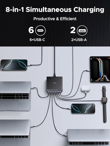- No shortage of ports: Power up to 8 devices with 6 USB C and 2 USB A ports simultaneously at full speed, phones, tablets, laptops all charge together. Compact design eliminates cable clutter while ensuring everyone stays powered.