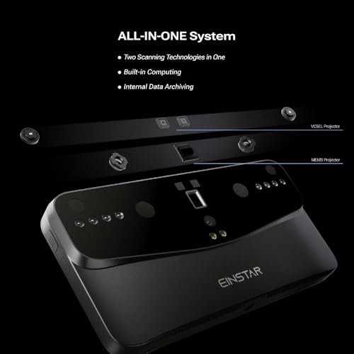 - 【All-In-One Design】Einstar VEGA equipped with VCSEL and MEMS projectors, 8-core 2.4GHz CPU 32GB RAM 512GB SSD. Two scanning technologies in one, built in computing and internal data archiving. You can take the VEGA with you wherever you go. Scan, save, and share the data at any time, unleashing endless possibilities with 3D vision.