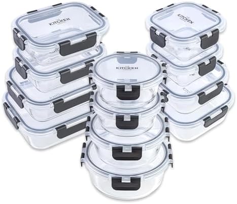 Craft Delicious Meals, Store Food, and Organize Your Fridge with Glass Containers That Do It All Upgrade to borosilicate glass food storage containers with lids designed for everyday life. This premium 24-piece meal prep container set is BPA-free, non-toxic, and airtight with a leak-proof seal to keep lunches, leftovers, fruits, vegetables, and pantry items fresh. Thermal-shock-resistant borosilicate glass moves from freezer to a preheated oven (glass only), then to the microwave and dishwasher. Clear, stackable, nesting shapes save space in the refrigerator, pantry, and cabinets—ideal for busy families and healthy meal prep. Why You’ll Love It Healthier Materials: Thick, durable, BPA-free, non-toxic borosilicate glass is non-porous and odor/stain-resistant to help keep flavors pure.Airtight & Leak-Proof: Hinged snap-lock lids with a silicone gasket lock in freshness for meal prep, lunch, and leftovers.Temperature Safe: Oven safe up to 450°F (glass only), plus microwave, freezer, and dishwasher safe. Remove lids before heating.Space-Saving Organization: Stackable, nesting containers in square, round, and rectangular shapes keep the fridge, pantry, and cabinets tidy.Gift-Ready Packaging: Secure, presentation-ready box—perfect for housewarmings, weddings, holidays, or new homes.Size Overview Rectangular (4): 1×35 oz (8×6 in), 1×21 oz (6.75×5 in), 2×12 oz (4.2×5.5 in)Square (4): 1×27 oz (6 in), 1×17.5 oz (5.2 in), 2×11 oz (4.3 in)Round (4): 1×32 oz (6.75 in), 1×21 oz (5.9 in), 2×13.5 oz (5.2 in)Height range: 1.75–2.3 inProduct Details 24-pc set: 12 glass containers + 12 matching snap-lock lids (with silicone gasket)Thermal-shock-resistant borosilicate glass for everyday durabilityAirtight, leak-proof closure helps keep food freshOven (glass only), microwave, freezer, dishwasher safe; remove lids before heatingStackable, nesting design for compact pantry and fridge organization ::contentReference[oaicite:0]{index=0}