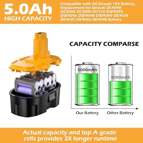 - 【Battery Details】Battery Type: NI-MH; Voltage: 18V; High Capacity: 5000mAh.Replacement Battery for Dewalt 18V Battery DC9099 DC9096 DC9098 XRP Battery