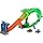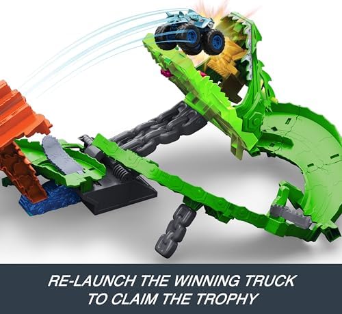 The race is on between Hot Wheels Monster Trucks Great Bite and Rageasaur to defeat the nemesis dragon in the Sharks vs. Dinos Dragon Destruction Playset. Load the included toy trucks into the double slam launcher, then send them racing side-by-side through the mouth of the cyborg dragon. They race down through the dragon's insides, where a chainsaw diverter randomly chooses if one of the trucks gets knocked off the track. Once the dragon collapses, kids can launch the victorious truck into its mouth and claim the trophy. Two 1:64 scale Hot Wheels Monster Trucks are included. Colors and decorations may vary.