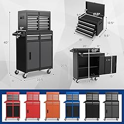 【Tool Chest with Detachable Tool Box】Overall Dimension: 23.5” x 11” x 40” (L x W x H) The tool cabinet consists of 5 drawers, two trays, a large bottom cabinet and a top box. The whole storage cabinet can be detached into a box and a rolling tool chest, which can be used separately or together according to your requirement. When not in use, the tool box can be stored in lower chest for saving space. 【Powder Coated Steel with EVA Liner】Adopting premium steel with powder coating, this heavy duty tool chest is durable, rustproof and easy to clean. In addition, the EVA padding inside drawers has good cushioning, heat insulation, effectively protecting your tools. 【Universal Wheels with Brakes】This tool chest has four flexible universal wheels, and two of them have braking function. A locking bar will prevent the drawers from sliding out and the cabinet door from opening while rolling. 【Large Capacity for More Tools】The bottom shelf can be adjusted or removed for tools of different sizes. Some small tools can be hung on the cabinet door with movable hooks. 6 tool holes in the side handle can also be used to store tools such as screwdrivers. 【Keep Tidy and Save Time】Goplus tool chest has enough space for your collection of tools. It would be great to have them all in one place and not lie all over the garage and house. Also, it makes things easy for you to find different tools.