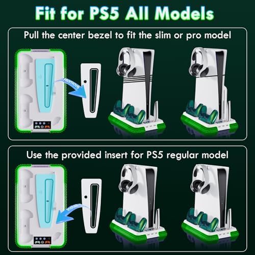 - 【Safety and Organized All PS5 Accessories】 This PS5 Cooling stand for PS5 pro keep your room tidy, it can hold ps5 headset wireless, screw storage, ps5 pro Disc & Digital Console, ps5 media remote, controller charger, ps5 cooling system. The PS5 Stand features overcharging, overheating, overvoltage and short circuit protection.