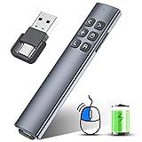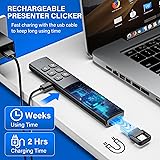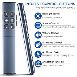 - This presentation clicker usb c with air mouse is suitable for teachers, white-collar workers, leaders, orators, etc. who often need to speak or demonstrate. Effortlessly manage your powerpoint presentations with this presentation clicker with mouse. With this powerpoint laptop clicker,you don't need to stand beside your computer or blackboard. This power point remote clicker helps you gain more confidence in your teaching,coaching,speech,meeting or conference presentations. FEATURES: Basic functions of this projector clicker wireless with pointer: Red light pointer,page up/down,switch windows,full/black screen, volume control, and air mouse. Control Range of this presentation clicker with pointer: ★100ft wireless remote control range help you make ordinary presentations extraordinary with this power pointer wireless presenter; ★656ft red light range help you interact with your audience and still maintain control of laptop or pc with this slide advancer clicker. PLUG AND PLAY Computer Remote Presenter: ★The one-piece design is adopted to embed a USB&USB C receiver into the powerpoint remote clicker, which makes the remote clicker with air mouse convenient to carry and also prevents the loss of the receiver. ★Store the USB receiver in the wireless slideshow clicker when the presentation is over. ★This remote clicker for powerpoint supports these operating system: Windows 2003/XP/Vista/7/8/10, Mac OS, Linux, Android. ★This powerpoint remote advancer supports these office software: PowerPoint/Keynote/Prezi/Word/EXCEL/ACDSee/iWork/Onenote/Google Slides,etc. SPECIAL DETAILS: ★The EVENLY DISTRIBUTED BUTTONS are comfortable and easy to find by touch. ★Product class: Class 3R. ★Max output power:<5mW.