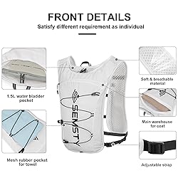 Ski Boot Bag 55L Storage Capacity:Roomy enough to pack all your skiing gears in one skiing bag. Can store your Ski suit, Helmet, Goggles, Gloves & other Accessories and keep them orderly. If you need a skiing boot bag, this one will definitely satisfy you Organized And Easy To Reach:Individual Compartment allows you to pack your skiing essential ORDERLY. Quickly access your gears by using Handy Zippers. No worries about taking a long time to find your gears in a deep place and in vain. This ski bag weights 1.23kg, has a size of 12.5 x 13.3 x 20.8 inch / 32 x 34 x 53 cm 5L Capacity And Multiple Storages: 5L Hydration vest with multi-pocket design. An individual bladder compartment for your 1.5L bladder, a separate large main zippered pocket for storage your towel, snacks,jacket etc.The 2 stretch pockets on the front straps can store 450ML water bottle. There's also a zippered pocket for your cell phone exclusively, and various pockets for nutrition, running gear and other running essentials. Carry all your essentials effortlessly with the running water vest. Ergonomic Adjustable Fit:Semsty hydration running vest adjustable strap design for easy adjustment and outstanding stability, reduces bounce and ensures a great fit while running. The hiking backpack water bladder vest's adjustable straps tighten from the shoulders to the waist to give the hydration vest backpack a better fit, reduce sway in motion, and distribute the weight of the 1.5L hydration bladder. Smooth chest snaps that turn diagonally without snagging. 100% Satisfaction:If you have any problems, please reach out to us, we will reply within 24hrs. (We provide replacement services for quality problems within 1 year and lifetime customer service)