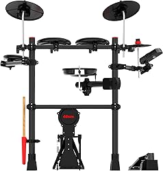 COMPREHENSIVE PLAYABILITY: The ddrum EFLEX BT8 kit includes three tom pads, a dual-zone snare pad, a 9″ ride cymbal with bell zone and choke, a 9″ hi-hat pad, and a bass drum pad with pedal; Contains essential accessories such as a throne, drum sticks, and a stick holder to enhance the realistic drumming experience for immediate play RESPONSIVE MESH HEADS: The mesh heads deliver a natural feel and quiet performance, making them suitable for practice with minimal noise disruption BLUETOOTH MODULE: Wirelessly connect to your favorite songs using the Bluetooth-enabled module, which offers 20 preset kits for varied drumming styles DOUBLE BASS MODE: The double bass mode allows the hi-hat controller to function as a second kick drum, providing you with greater versatility for advanced playing techniques and rhythmic creativity EVERYTHING IN ONE BOX: Austin Bazaar shows appreciation for your purchase by including additional accessories; This bundle comes with a headphones for a clear audio experience when performing or practicing, a drumstick bag to keep your drumsticks organized and protected and an Austin Bazaar polishing cloth to keep your drum kit in mint condition NOTE: Accessories included as part of the drum set are throne and sticks