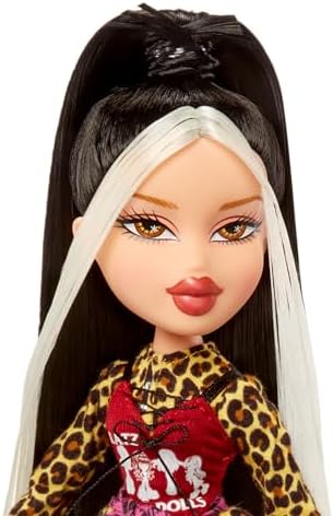 The Bratz are back with new STYLIN’ looks, but this time they want to share their fashion passion with you! This Bratz doll comes with a matching shirt for you to customize. Individual fashions, matching passions! Jade customized her graphic tee by turning it into a cropped tank and layering it over a leopard print button up. Paired with a skirt, boots, a matching handbag, and charmed-up glasses. Her hair is long with a blonde money piece and her look is giving soft glam with bleached brows.