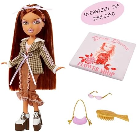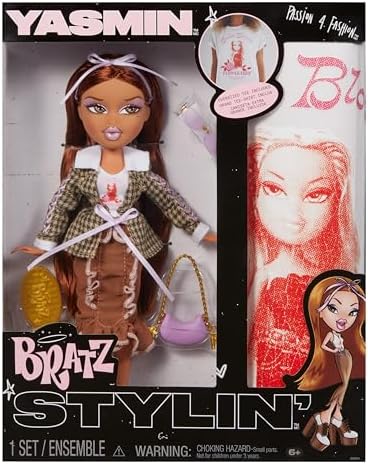 The Bratz are back with new STYLIN’ looks, but this time they want to share their fashion passion with you! This Bratz doll comes with a matching shirt for you to customize. Individual fashions, matching passions! The Bratz are back with new STYLIN’ looks, but this time they want to share their fashion passion with you! This Bratz doll comes with a matching shirt for you to customize. Individual fashions, matching passions! Yasmin customized her graphic tee by turning it into a cropped tank and layering it under a houndstooth plaid coat. Paired with a midi skirt, heeled oxfords, a matching handbag, and shades. Her hair is long with a pink bow and her look is giving pastel glam with an icy, pink lip.