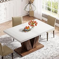 - 【White & Oak Dining table】 The rustic kitchen dining table is crafted with a simple design and elegant shape. Whether you want to enjoy dinners with your family or gather with friends, this table will satisfy your needs. 【Enough for 4 People】 Measuring 47.2" W x 31.5" D x 29.9" H, with a weight capacity of 250 lb, this table can accommodate 4-6 people, making it a good choice for small apartments. It is the perfect piece for family gatherings or dinner parties with friends. 【High-Quality Table】 The table top has enough hardness and features a 1.57-inch thickness. Its beauty, strength, and easy maintenance make it stand out. The triangular column and chassis provide strong support, making the table reliable for a long time. 【Versatile Use】 The rectangular indoor dining table can be used both commercially and at home. It fits perfectly in a variety of settings including living rooms, kitchens, cafes, breakfast nooks. With this industrial dinner table, you can unlock limitless possibilities for your home. 【Easy to Assemble】 There is a manual and a full set of hardware necessary to guide you through the assembly process easily. We provide a 24-month warranty and friendly customer service. We will give you a satisfactory answer if you have any questions.