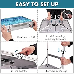 - This folding camping table is designed to be your ideal companion for both outdoor and indoor activities. Featuring a sturdy aluminum frame and a waterproof surface, it’s built to withstand the elements while offering convenience and ease of use. Whether you're camping, enjoying a picnic, hosting a BBQ, or setting up in your backyard, this adjustable height table can be customized to suit any task. With an easy-to-fold design and a compact size when folded, it’s portable, lightweight, and easy to carry.