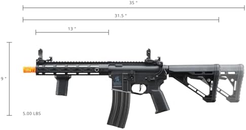 Specifications: Brand: Lancer Tactical Operation: Electric Automatic Construction: Nylon Polymer Frame / Metal Barrel Assembly Firing Modes: Semi-Automatic, Full-Automatic, and Functioning Safety Muzzle Velocity: 380 - 400 FPS (w/ 0.20g BBs, high FPS spring *installed*), 330 - 350 FPS (w/ 0.20g BBs, low FPS spring *included* Low FPS spring not included for Canada) Magazine Capacity: 140 Round High Speed Mid-Capacity Magazine (Compatible with most M4 magazines) Battery: 11.1v Stick Lipo Recommended (Battery and charger included) Battery Connector: Rear Wired Via Deans Connector Gearbox: Full Metal Version 2 Hop-Up: Yes, Adjustable Rotary Style Handguard Length: 13 inches Inner Barrel Diameter: 6.03mm Length: 31.5 - 35 inches (Stock Retracted / Extended) Weight: 5 lbs