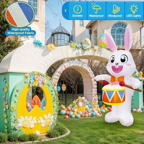 - Durable Construction: Crafted with 210T high-quality fabric and precise stitching technology, the blow up easter bunny is designed to withstand the test of time and various weather conditions. Whether it's a sunny day or a rainy evening, the bunny drummer stands tall, maintaining its structural integrity. The ease of folding and storing the easter bunny decor means that Easter decor can be conveniently packed away when not in use.
