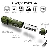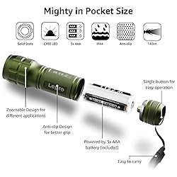 PORTABLE SMALL SIZE - Our LED flashlight is portable small size, Length: 4.2in, Diameter: 1.2; Weight 128g, fits well in your hand or pocket. Compact to fit easily into your pocket wherever you SUPER BRIGHT & LONG-LASTING - Equipped by LED, the beam distance of flashlight is up to 492ft. Luminous flux is about 140 lumen in full brightness. Easily light up an entire room. SKID-PROOF DESIGN & IPX4 WATER RESISTANT DESIGN - The IPX4 water resistance rating means it is perfect to use in wet condition, light rain day or snowy day. Made from military-grade aluminum, it ZOOMABLE FLASHLIGHT- Led flashlight has ability to narrow or widen the area you wish to light. You can stretch the head-pulling zoom to adjust its focus and get spot beam or flood beam you need. WHAT YOU GET- Bright and handheld led flashlight *2, AAA batteries*6 and instruction manual.