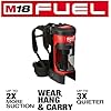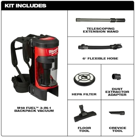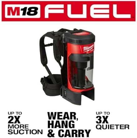 The M18 FUEL 3-in-1 backpack vacuum brings unmatched performance, portability, and versatility to the jobsite cleanup category. A POWERSTAT brushless motor and cyclonic technology delivers up to 2X more suction than the competition, allowing users to clean up drywall dust, concrete dust, wood/metal shavings and other common jobsite debris quicker and more efficiently. A quick release removable harness with an integrated canister hook allows users to wear, hang, and carry the product for ultimate cleaning versatility on any jobsite. At only 76 dB(A), the vacuum is up to 3X quieter than a traditional jobsite vacuum, allowing for quiet operation in occupied spaces. As a part of the M18 system of tools, it is powered by REDLITHUM battery packs, which deliver up to 25 minutes of run time on a HIGH DEMAND 9.0 battery pack in high mode, and over 40+ minutes of run time in low mode. For added convenience, the 0885-20 empties debris at the click of button, reducing downtime when the canister is full and allowing users to get back to the task at hand. Whether you are doing spot, area, or final cleanups, the M18 FUEL 3-in-1 backpack vacuum can go anywhere on any jobsite to complete countless cleanup tasks.