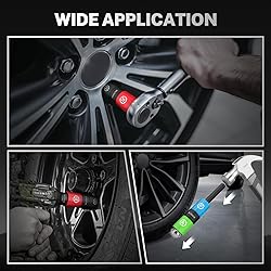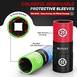 6pc Lug Nut Socket Set: Includes 4 dual-end flip socket set, metric 17 - 19 - 21 - 22 mm & SAE 3/4 - 13/16 - 7/8 - 15/16 inch. Comes with a 3" extension bar and a knockout rod for removing stuck nuts. Durable Construction: The sockets in this thin wall lug nut socket set are manufactured from chrome molybdenum steel, ensuring excellent strength and wear resistance, ideal for handling various wheel lug nuts. Scratch Protection: This non-marring lug nut socket set features a thin wall design with a rotatable protective nylon shell, which prevents scratches on the paint surface of the alloy wheel while removing tire screws, safeguarding your alloy wheel. Enhanced Grip: These impact lug nut sockets are designed with a 6-point flank drive, which prevents fastener round-off by applying force to the flat sides of a fastener rather than its corners, making it an effective tool for any tire lug nut socket set. Can Work Seamlessly in Tight Spaces: Thanks to our thin-wall lug nut socket set, tight spaces become a breeze. Each lug nut socket in this set has a color-coded plastic sleeve, making it easy to identify and locate the correct size quickly.