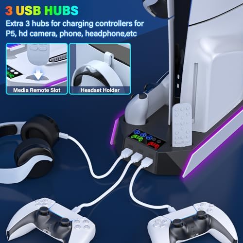 - All-In-One Multifunctional Base Stand For PS5 Slim - The ps5 slim cooling fan base stand has 2 pre-molded charging slots for ps-5 controllers, 1 slot for media remote, 1 headset hook for headphone, 3 USB ports and a cooling fan for dissipating heat for ps5 digital edition or disc version console, keeping accessories neat and organized while keeping the play-station 5 setup cool. 1-YEAR quality support. Package List: Stand for PS5 x1; Headset holder x1; USB cable x1
