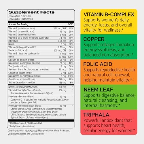 - Multivitamin for Women Capsules – These womens multivitamin capsules are vegan supplement crafted to fill nutritional gaps and deliver essential vitamins and minerals for daily balance. As an all in one vitamins for women, it supports energy conversation, immune function, and bone strength through Vitamins A, B, C, D & E and Zinc, Calcium with Magnesium. The 28-in-1 complex includes folic acid to help maintain reproductive wellness and support normal red blood cell formation, helping maintain vitality.