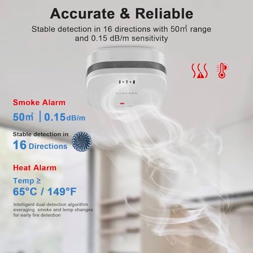 - 𝟏. 𝐑eliable 𝐒moke 𝐃etector for 𝐅ire 𝐀larms: High-precision photoelectric sensor, paired with an innovative pyramid-convex maze design, ensures accurate and stable smoke detection in 16 directions, covering an area of 50㎡ (0.15 dB/m sensitivity). Easily verify product functionality with the self-test button. With Pildegro, peace of mind comes alive in your home!