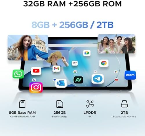 - 𝟑𝟐𝐆𝐁 𝐑𝐀𝐌 + 𝟐𝟓𝟔𝐆𝐁 𝐑𝐎𝐌/𝟐𝐓𝐁: DOOGEE T36 large android tablet packs 32GB of LPDDR4x memory (8GB physical + 24GB virtual), enabling effortless multitasking. doogee 12 inch tablet can handle multiple tasks running simultaneously without a hitch.Furthermore, tablet android features a 256GB high - speed storage capacity. With the option to expand DOOGEE T36 up to 2TB via a MicroSD/TF card, you'll have ample space to store all your favorite media, such as videos, photos, and more