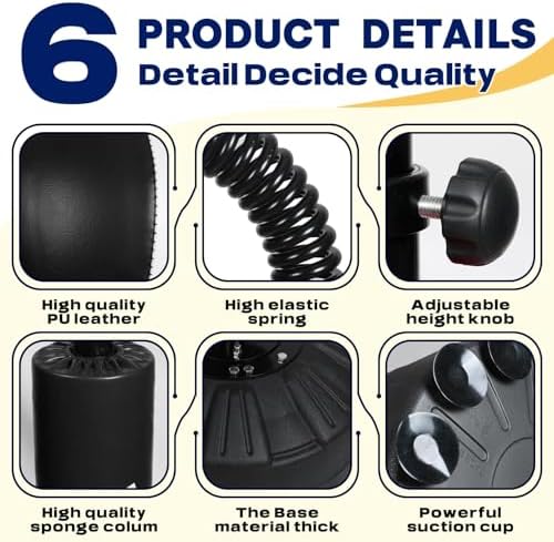 - 360° Reflex Spinning Bar: Experience comprehensive training with the standing reflex punching bag, featuring a 360° rotating reaction rod. This feature is ideal for improving reaction time, accuracy, and agility. The flexible spinning bar exercises arm muscles, aids in weight loss, and enhances overall coordination and reaction speed.