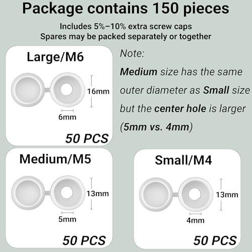 - Package Contains: A total of 150 screw cap covers, with 50 of each size (hole diameter 4mm, 5mm and 6mm). Note: Medium size has the same outer diameter as Small size, but the center hole is larger (5mm vs. 4mm). To prevent shortages due to transit damage, we include 5%–10% extra screw caps as spares. Depending on the packaging batch, these may be packed separately or with same-size caps