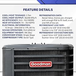 HEAT PUMP CONDENSER: Offers efficient heating and central air conditioner unit, ensuring year-round comfort. Its simple installation and energy-saving design make it a cost-effective, hassle-free choice. AIR HANDLER: Features cost-effective performance with its ECM blower motor and durable design, along with an all-aluminum evaporator and a factory-installed TXV kit that contribute to overall efficiency, often surpassing the paired condenser's tonnage. INSTALLATION KIT: The unit includes a 3/8" LL x 7/8" SL x 3/8" line set, a 1/2" X 4' 10 gauge whip, a non-fuse 60A disconnect switch, a 2 heat / 1 cool non-programmable thermostat, a 36" x 36" x 3" e-lite pad, and fitting coupling kit set. CERTIFIED SAFETY: AHRI Certified and ETL Listed, featuring a high-pressure switch, ground lug connection, and extended-life capacitors for long-term performance and reliability. OLD CONDENSER: This unit is an ideal replacement for older Goodman models such as GSZ140361 or GSZB403610. Upgrade your system to enjoy better performance and efficiency. WARRANTY CONDITIONS: A duration of 10 years parts when installed by a tech and registered online with the manufacturer at no additional charge.