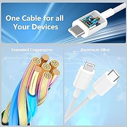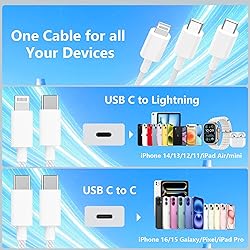 【iPhone Cable Versatile 2-in-1 Design】:This 2 in1 charging Cable is designed to simplify your charging setup. It combines two modes - USB C to C, USB C to Lightning - in one cable.Keep your workspace clean with our efficient Multi USB 2-in-1 Charger Cable. Built-in USB-C and Lightning connectors. Just one cable achieves fast charge for all iPhone, iPad, or USB-C mobiles and laptops, it would make your daily charging experience more convenient and wonderful. 【60W Fast Charging Capability】:Equipped with Latest-generation, future-proof fast charging technology. This USB C Cable provides 60W Max output power, full charge your iPhone 16 Pro Max from 0% to 70% in just 30 mins. Supports data transfer speed up to 480Mbps. It efficiently charges your devices, such as laptops, smartphones, tablets, and other USB-C port devices, in a shorter amount of time compared to other cables. 【One Cable for iPhone or Android】:Two-in-one fast charging cable fit for iPhone 17/16/15/14/13/12/11 and more iphone models, iPad Pro/Air/Mini and more ipad models; Samsung Galaxy S24/ S23 Ultra/ Note 10, Google Pixel and more c type android phones, Airpods, DJI, Designed to charge a wide range of devices. Whether you're traveling or commuting, our versatile cable is your ideal companion. 【Reliable & Safe Fast Charge】:Every 2 in 1 multi charger cable built in original MFi certification C94 Chip, premium material and strict quality testing ensure your devices are charged safely. it has Passed 25,000+ bends test, also supports fast data transfer of up to 480 Mbps. High quality Woven material makes our USB C cable durable and strong while remaining flexible and tangle-free. 【Quality Commitment and Guarantee】:3FT 60W USB C to C & Lightning Cable. Believe that our products will bring you a pleasant experience,Our cable has a 3-year warranty, and we promise that as long as there are quality issues with the data cable, we will only replace it and not return it. At the same time, we support a 36 month product warranty and a 7-day 24-hour online service.