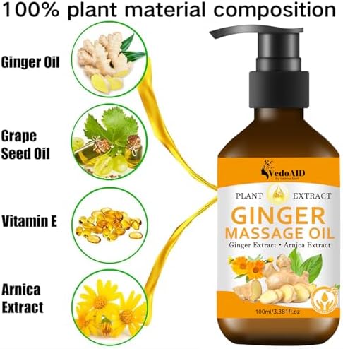 - Natural Ginger Body Oil with Arnica Extract: Infused with ginger oil, arnica oil, vitamin E oil, and grapeseed oil, this relaxing massage oil nourishes the skin, making it perfect for sore muscle massage oil treatments and daily body care.