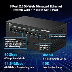 - Real HD 2.5G Ethernet Switch 8 Port Unmanaged Network Switch with 8 x 2.5 Gigabit Ethernet Ports | 1 x 10G SFP+ Port | Multi-Gigabit Compatible with 10-100-1000Mbps Devices | 60G Bandwidth | Plug & Play | Fanless Quiet | Sturdy Metal Casing 【Plug and Play】Easy setup with no software installation or configuration needed for this ethernet switch. 【Sturdy and Quiet】Compact & sturdy metal housing with 4KV lightning protection design make this network switch safe to use in various environments. The fan-less design quietly integrates with your office environment and featured good heat dissipation, safe to use in temperatures from -20 to 50℃. 【2.5G Super-Fast】This 2.5 gigabit switch features 8x 2.5G RJ45 ports and 1x 10G SFP port, providing higher-speed connectivity for your devices and allowing you to easily upgrade your network to support the latest 2.5G ethernet standard. 【Application】The muti-gigabit switch can work with a wide range of ethernet devices, including 4K Video, Laptops with 2.5G Ethernet Adapter, Wifi 6 Router, Wifi 6 AP,2.5G Gaming PC,2.5G NAS computers. To achieve better performance, it's better to upgrade all your devices to 2.5g to get a better experience. 【Easy Upgrade】Works with your existing Cat5e, Cat6, or Cat 6a cables, saving you the hassle of running new cables to support the higher speeds. This 8 Port Ethernet Switch 2.5G is worth your while!