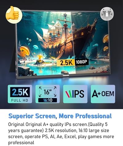 - [2.5K QHD+ Laptop Monitor] The K16 portable screen features a 16-inch IPS LCD display with a 2560*1600P resolution, HDR technology, a maximum brightness of 500 nits, 100% sRGB wide color gamut, and dual 2W stereo speakers, delivering exceptional image quality and sound. It offers a clearer, more immersive audio-visual experience. The portable gaming monitor provides a 144Hz refresh rate, 3ms low latency, and FreeSync for a smoother gaming experience. The flicker-free, low blue light technology allows you to use it for long periods without eye strain.