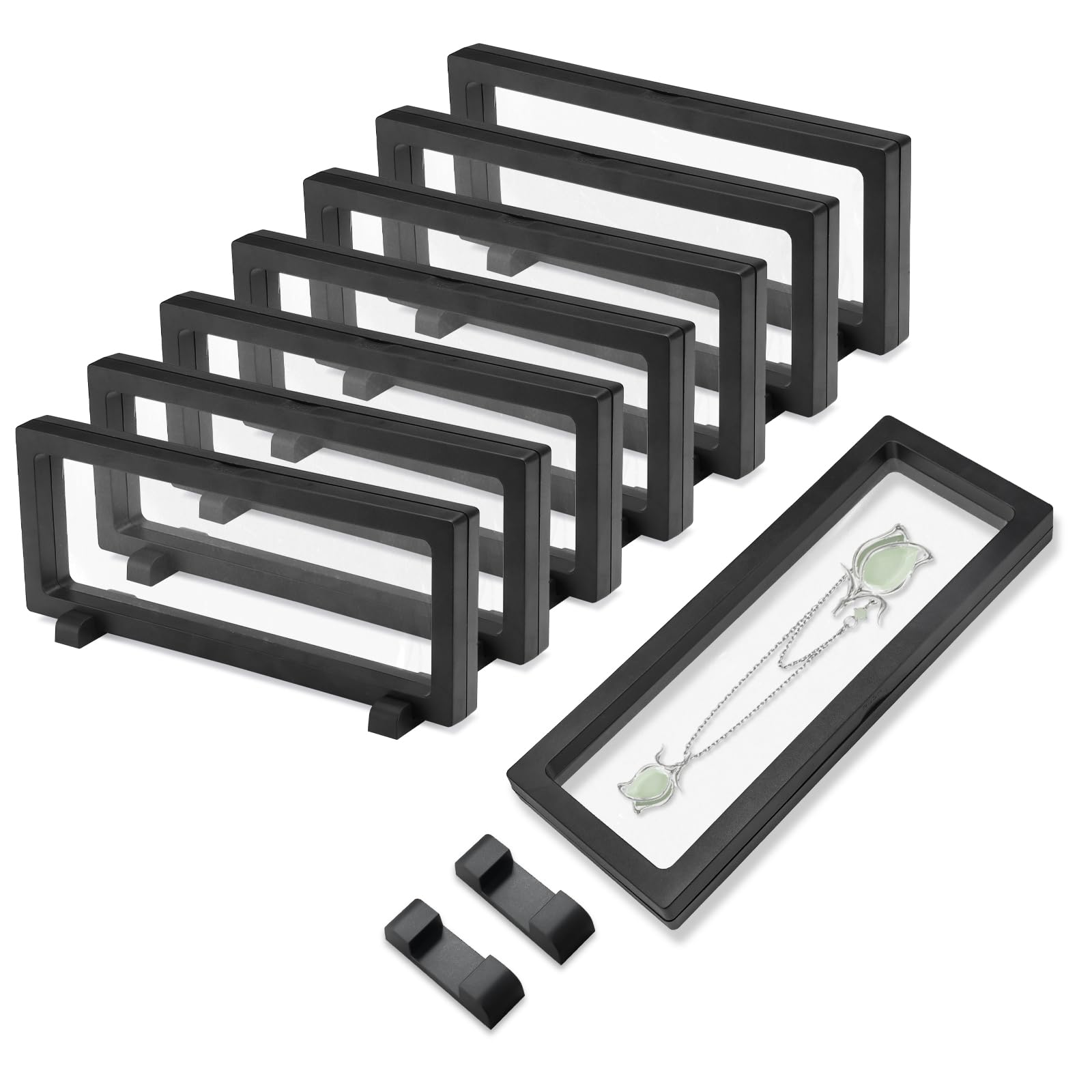- 【Exquisite set】You will get 8 plastic floating frame display holders with stands. Rectangle frame size: 9 x 3.54 x 0.75 inches, Display screen size: 8.2 x 2.7 inches inner diameter. The compact and elegant design not only saves space but also exudes grandeur, easily integrating various decorative styles.