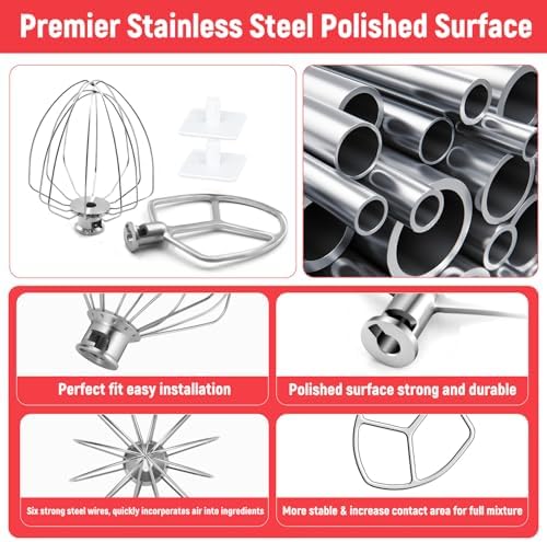 - 💕High Performance: The mixer attachments are designed for mixing and kneading yeast doughs. The 6 wire whip effortlessly incorporates air into ingredients, resulting in fluffy whipped cream, perfect boiled frostings, and cakes with whipped egg whites. And the flat beater is perfect for quickly and thoroughly mashing potatoes