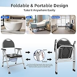 FOLDABLE & SPACE-SAVING DESIGN: Our bedside commode chair features an innovative folding mechanism, allowing it to be easily collapsed and stored when not in use. Push the buckle downward, then secure it into the groove to keep the chair in the open position. Pull the buckle upward to fold the chair. Its compact design is perfect for small bathrooms or limited spaces, making it ideal for individuals with space constraints. The detachable commode bucket can be conveniently pulled out from the front for hassle-free cleaning. 5 HEIGHT FOR CUSTOMIZING: 5 levels height adjustment provide for you to customize your suitable height. Overall Dimensions: 21"(L) x 25"(W) x 36"-39"(H); Seat Dimensions: 17"(D) x 17"(W) ; Outside Legs: 21"(D) x 25"(W) ERGONOMIC DESIGN: The ergonomic design with a comfortable backrest and wide armrests. The bedside commode with backrest and armrests can hold up to 350 pounds and is designed to provide stable support for seniors, pregnant women and people with disabilities. STABLE STAINLESS STEEL: The 21-inch wide heavy-duty shower chair with armrests and backrest is soft and comfortable, making it easier and more comfortable for larger sized individuals weighing up to 350 pounds. MULTIFUNCTIONAL 4 IN 1 TOILET: Can be used as a shower chair, toilet safety rack, bedside toilet and raised toilet, this drawer toilet is more convenient to clean and use. Meet the different needs of the elderly, adults, disabled or pregnant women in the bathroom, bedroom or hospital.