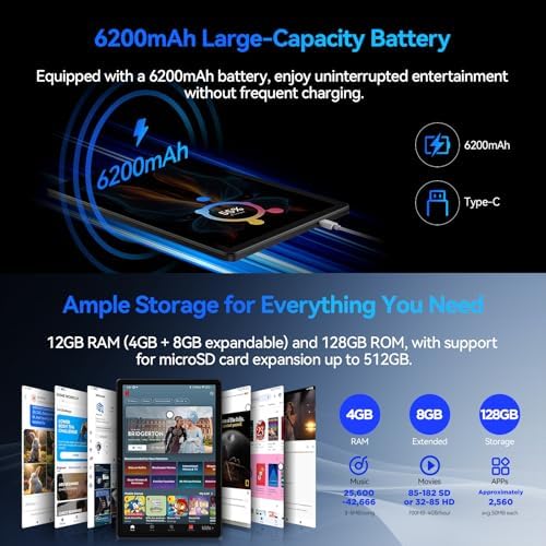 • 【6200mAh Large Battery & 12GB + 128GB + 512GB Storage】Equipped with 12GB of RAM (4GB + 8GB virtual) and 128GB of storage, expandable up to 512GB, the iPlay 60S tablet offers seamless multitasking and ample storage for all your content. Its 6200mAh battery ensures long-lasting use without frequent recharges. Additionally, the built-in gravity sensor automatically adjusts the screen's orientation for the optimal viewing angle.