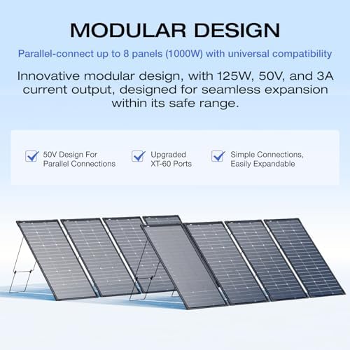 • [Modular Design] Connect up to 8 panels in a parallel connection (1000W), or as many as 12 × 125 watt solar panels in a 4 parallel, 3 series setup to generate up to 1656W. The EcoFlow 125W Bifacial Solar Panel features an innovative modular design, with 125W, 50V, and 3A current output.